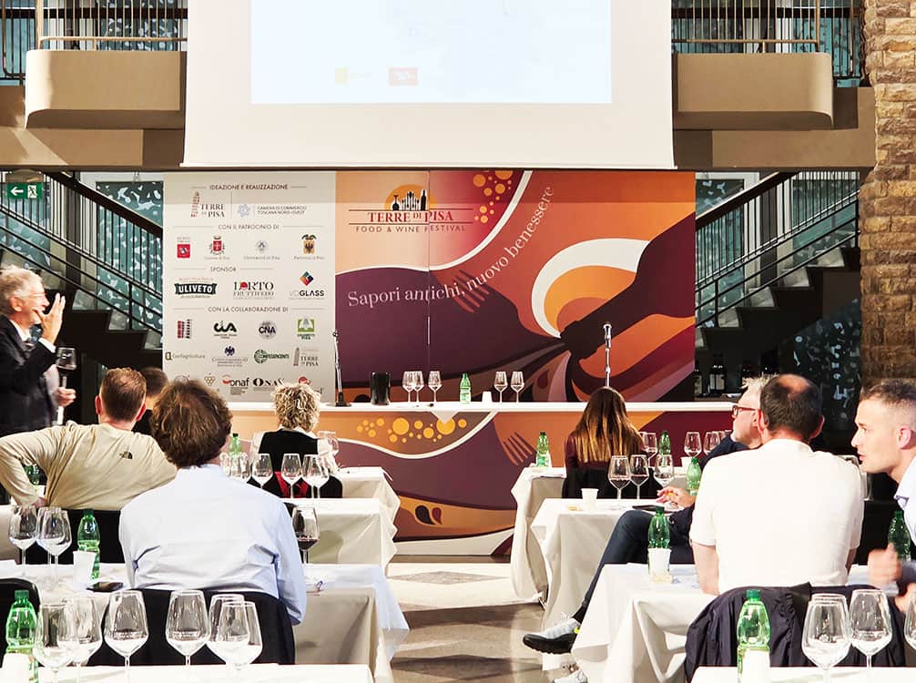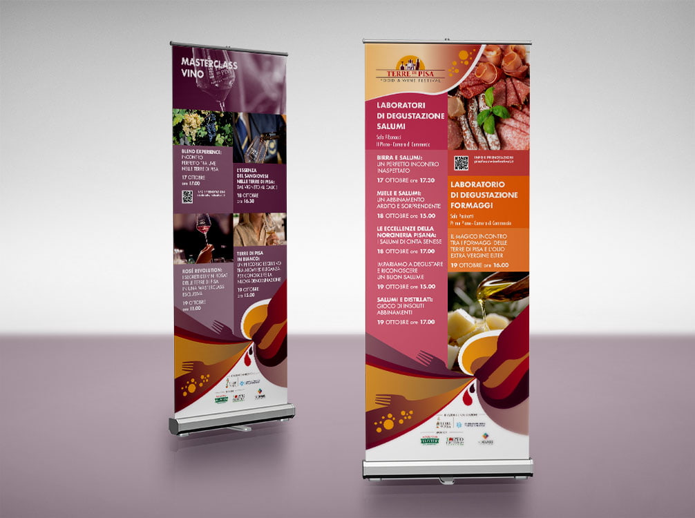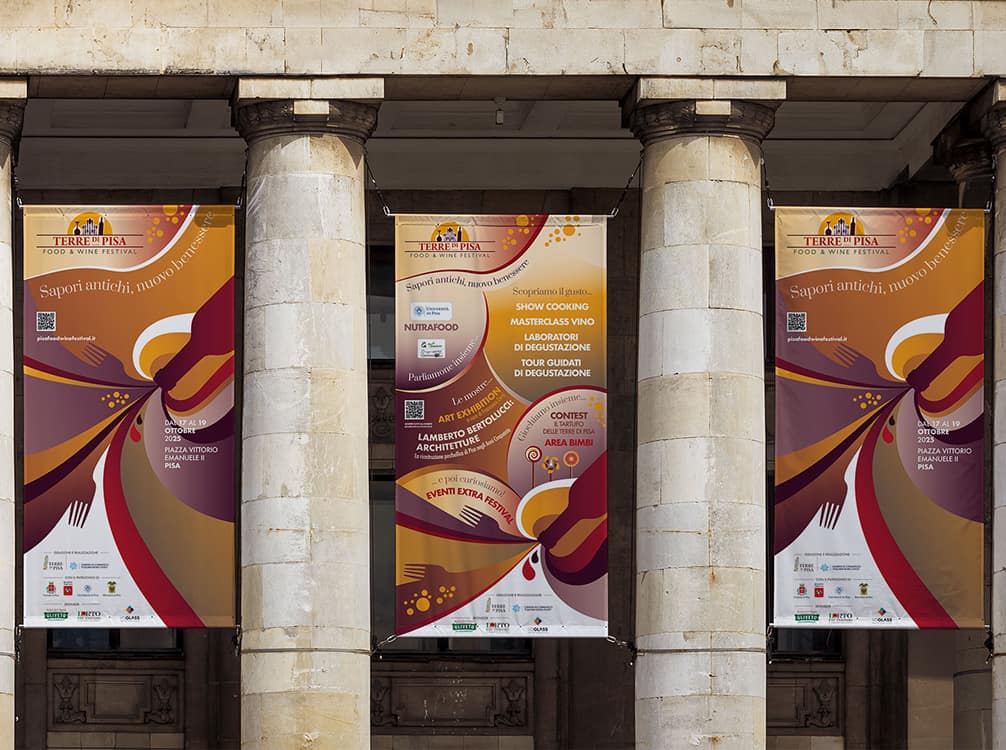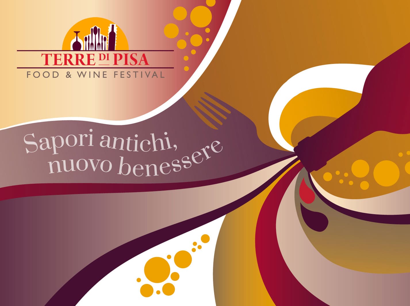Illustrazione dai colori autunnali dove le linee dolci, che richiamano le colline del territorio, nascono da una bottiglia di vino rosso. Le linee formano silhouette di forchette, accompagnando graficamente gocce di vino e una emulsione d'olio, tra i prodotti di punta delle Terre di Pisa.