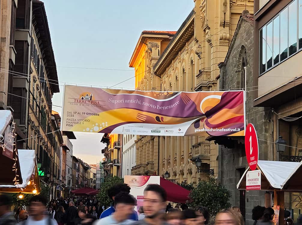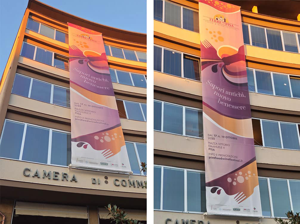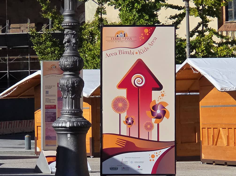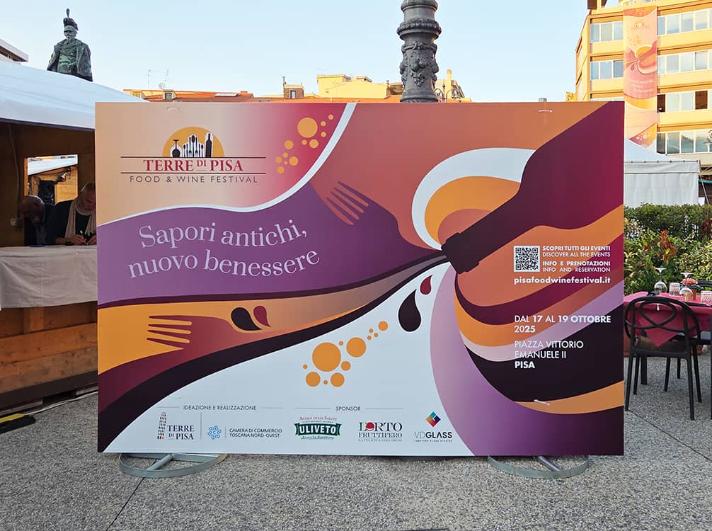 Illustrazione dai colori autunnali dove le linee dolci, che richiamano le colline del territorio, nascono da una bottiglia di vino rosso. Le linee formano silhouette di forchette, accompagnando graficamente gocce di vino e una emulsione d'olio, tra i prodotti di punta delle Terre di Pisa.